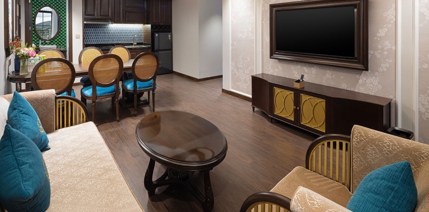Thiết kế gồm hai phòng ngủ riêng biệt kết hợp cùng khu vực sinh hoạt chung tiện nghi, Imperial Suite mang đến không gian lưu trú sang trọng, lý tưởng cho những chuyến đi cùng gia đình hoặc nhóm bạn. Bố cục được sắp xếp tinh tế, vừa đảm bảo sự riêng tư cần thiết cho từng thành viên, vừa tạo nên sự kết nối hài hòa trong những khoảnh khắc sum vầy.